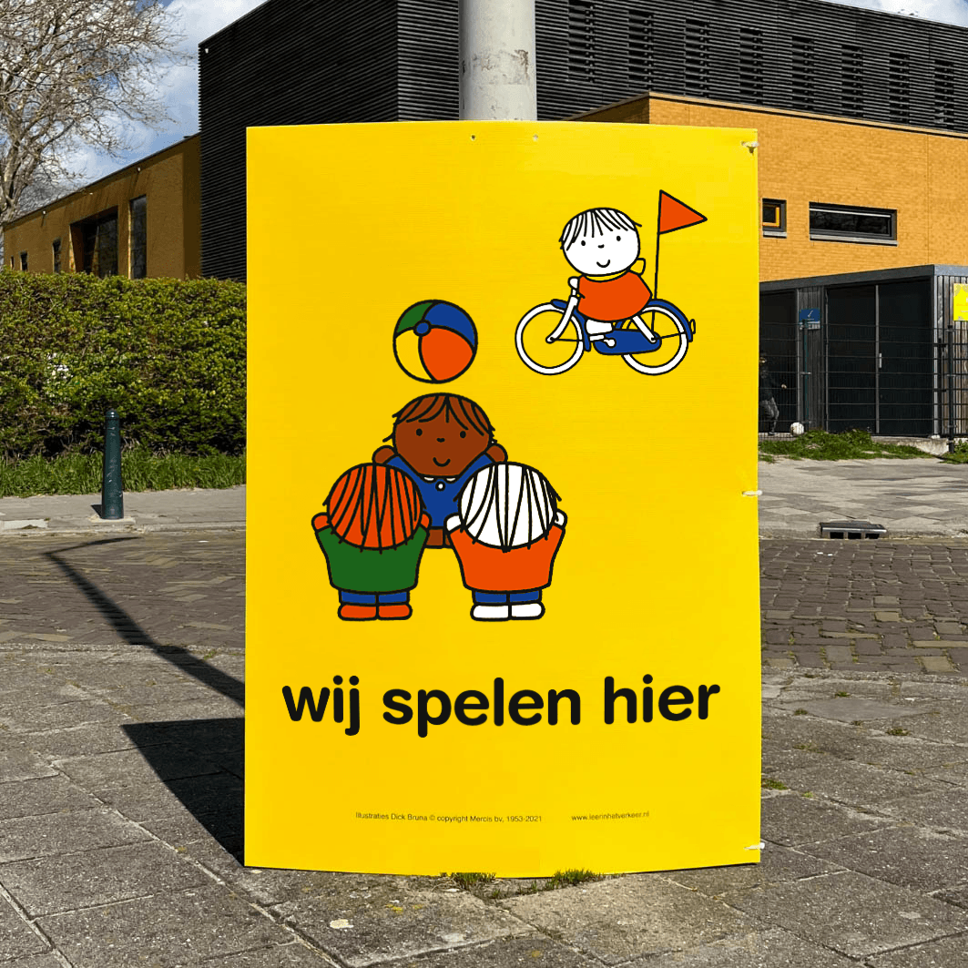 Een sandwichbord met opdruk vormt een effectief, gebruiksklaar hulpmiddel voor het informeren van verkeersdeelnemers over de aanwezigheid van een groter aantal (jonge) kinderen op de weg. Met opvallende illustraties van Dick Bruna worden bestuurders langs de schoolroutes attent gemaakt op de verhoogde verkeersdrukte na de zomerperiode.